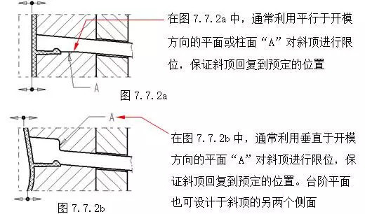 在斜頂機構中,為了保證斜頂工作穩定、可靠,應該注意以下幾點:(A)斜頂的剛性。增強斜頂剛性一般采用:1.在結構允許的情況下,盡量加大斜頂橫斷面尺寸。(參見第七章7.2節)2.在可以滿足側向出模的情況下,斜頂的斜度角“A”盡量選用較小角度,斜角A一般不大于20°,并且將斜頂的側向受力點下移,如增加圖7.7.1a中的鑲塊2,同時鑲塊可以具有較高的硬度,提高 模具 的壽命。(B)斜頂橫向移動空間。如圖7.7.1a所示尺寸“D”,為了保證斜頂在頂出時不與膠件上的其它結構發生干涉,應充分考慮斜頂的側向分模距離、斜頂的斜度角“A”,以保證有足夠的橫向移動空間“D”。(C)斜頂在開模方向的復位。為了保證合模后,斜頂回復到預定的位置,一般采用下面的結構形式。如圖7.7.2a;7.7.2b。