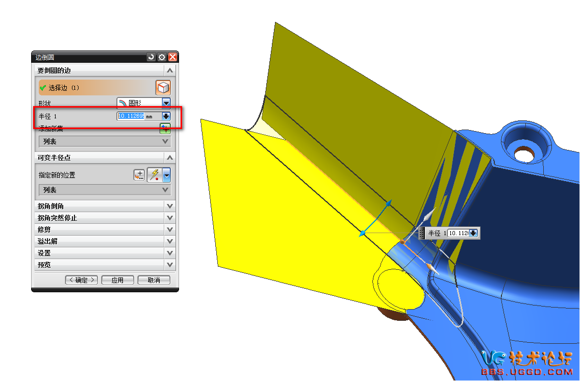 3.用“幾何屬性”命令測量兩個面之間的R角是多少,并且將R角的數據復制下來,然后用“邊倒圓”命令將R角倒上,粘貼R角的數據到半徑1對話框中,確定